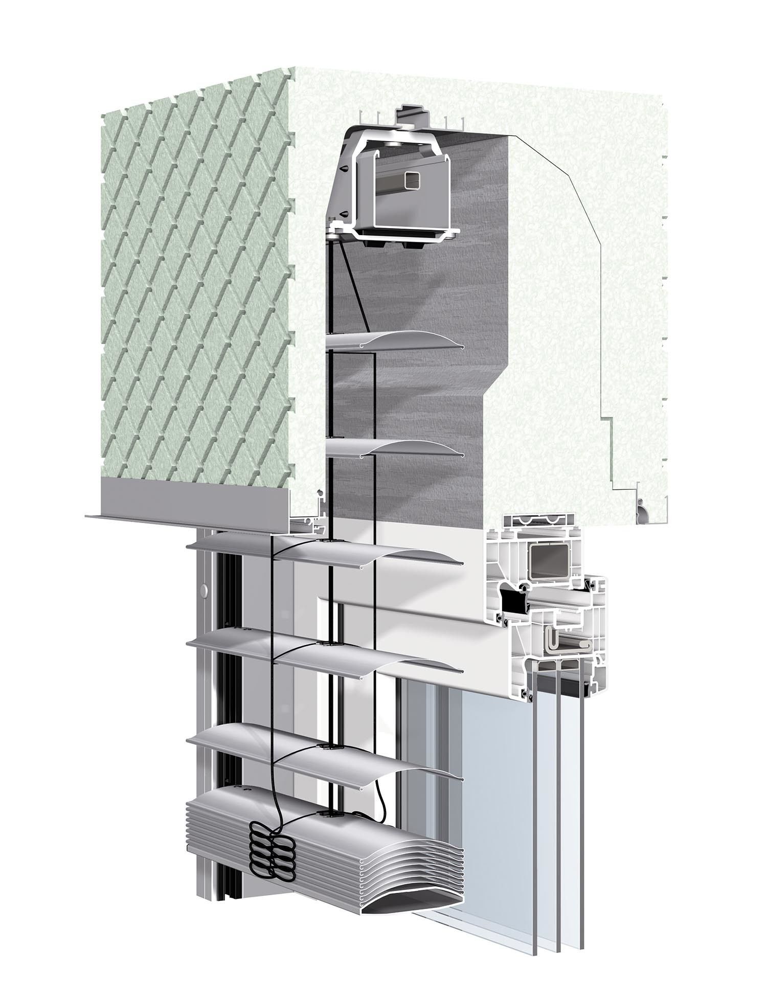 WAREMA Neubau-Aufsetz-Außenjalousien werden gemeinsam mit dem Fenster eingebaut. Dabei integrieren sie sich unauffällig in die Fassade und lassen sich hervorragend mit WAREMA Neubau-Aufsetz-Rollladen kombinieren. Ein patentiertes Führungsprofil zur Unterputzmontage ist optional erhältlich: Im Bereich zwischen Fenster und Führungsprofil ist hier eine Putzträgerplatte gleich integriert. So werden die hochgefahrenen Außenjalousien nahezu unsichtbar.